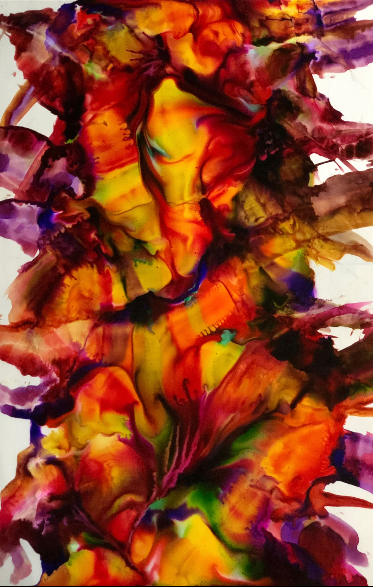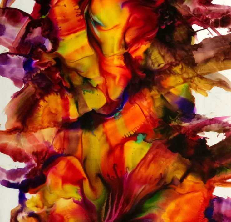 Alcohol ink is like a dance. Sometimes I lead, sometimes the ink leads. Sometimes it’s literally a battle. Experimentation meets imagination and exploration. Each painting I create begins with color. From there, a true experiment happens, derived from my imagination, and what alcohol ink does organically or can be manipulated to do. Alcohol inks are highly pigmented, fast drying dyes activated to move, bloom, and blend when they interact with 91% rubbing alcohol. Every piece is a unique experience because the medium overall doesn’t truly allow me to recreate a piece exactly in the same way. I’m always experimenting and exploring happy mistakes and colorful victories in my creative process.