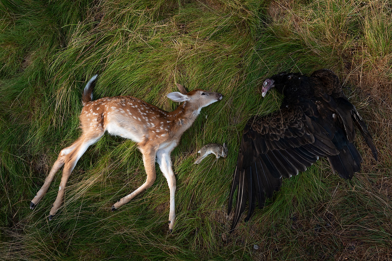 TD: I’m really struck by the euthanized image that you have in It Takes a Village. How did that come about where you have a deer, cottontail rabbit, and a turkey vulture lying next to one another? I mean, the image is wild.
