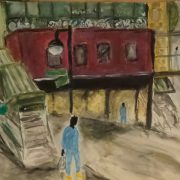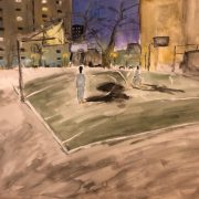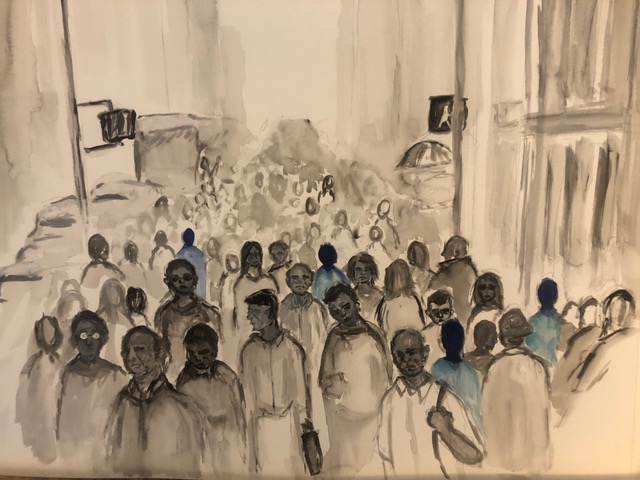 RW: The image that struck me most — these pajamas and people walking around — took hold of me. People alone, or even alone in a crowd, isolated, amid the city. I wanted to render the images I saw in my mind, so I started painting these images.